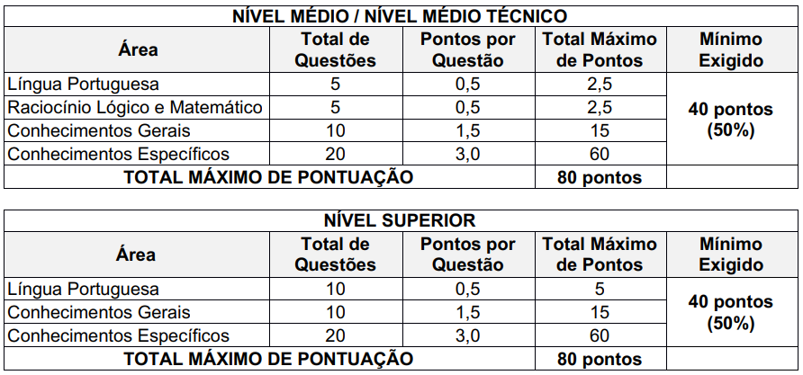 Para ser aprovado, o candidato precisava obter pelo menos 50% dos pontos totais e não zerar em nenhuma das áreas de conhecimento. A nota final foi composta pela soma dos pontos obtidos na prova objetiva.